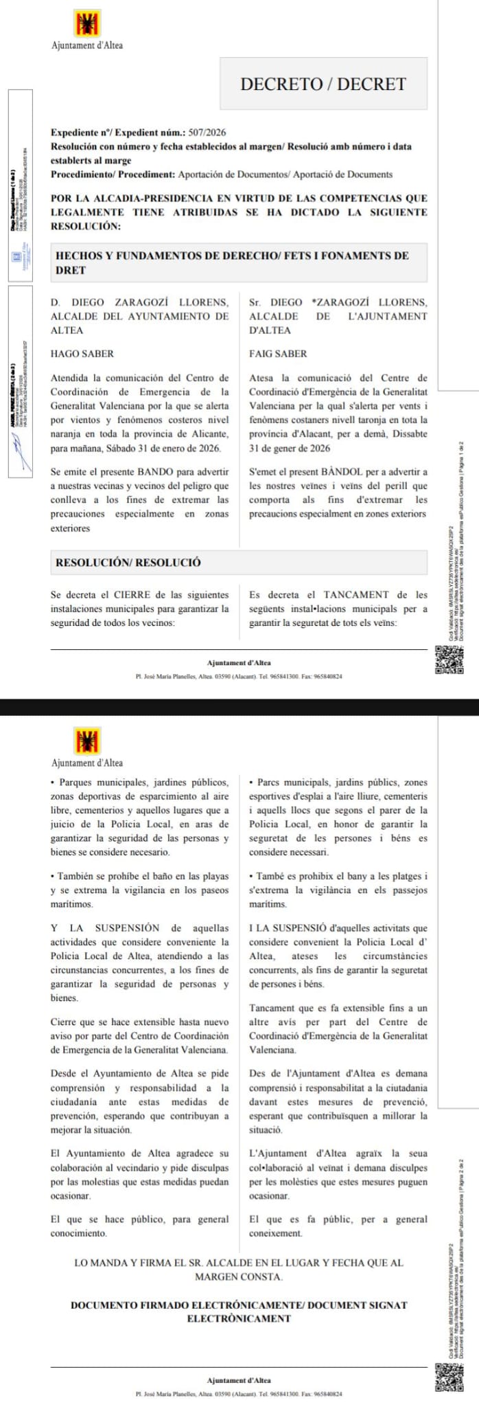 Davant l’episodi de forts vents i fenòmens costaners previst per a aquest dissabte 31 de gener, l’Ajuntament d’Altea ha actualitzat la informació relativa a l’alerta nivell taronja, incorporant noves cancel·lacions i mesures preventives amb l’objectiu de garantir la seguretat de la ciutadania.
