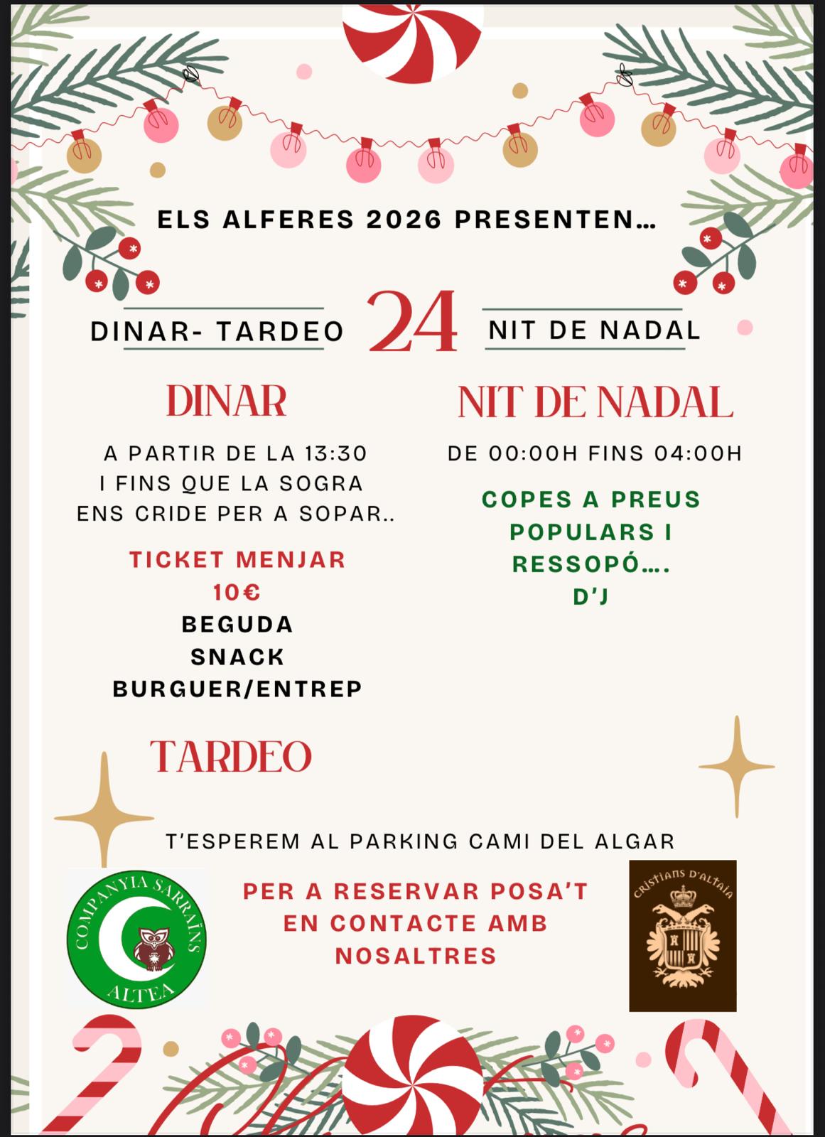 Per a participar en el dinar cal reservar prèviament amb l’organització. L’esdeveniment està impulsat pels Alferes 2026, la Companyia Sarrains d’Altea i els Cristians d’Altea.