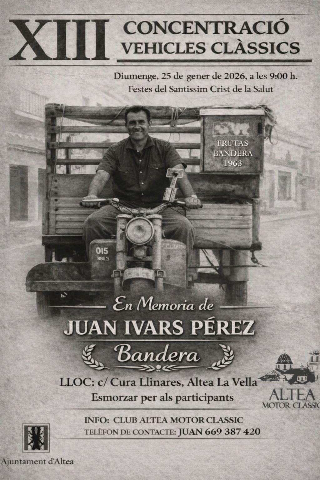 La trobada tindrà lloc al carrer Cura Llinares i estarà dedicada en memòria de Juan Ivars Pérez, “Bandera”, una figura molt estimada i vinculada al món del motor clàssic al municipi.