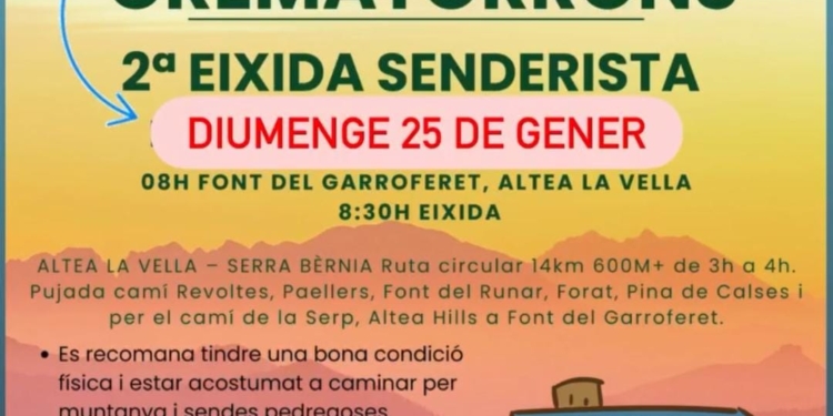 El pròxim diumenge 25 de gener de 2026, Amunt Altea Club celebrarà la segona edició de la seua eixida senderista “Crematorrons”, una activitat oberta a totes les persones aficionades al muntanyisme i a les rutes a l’aire lliure.