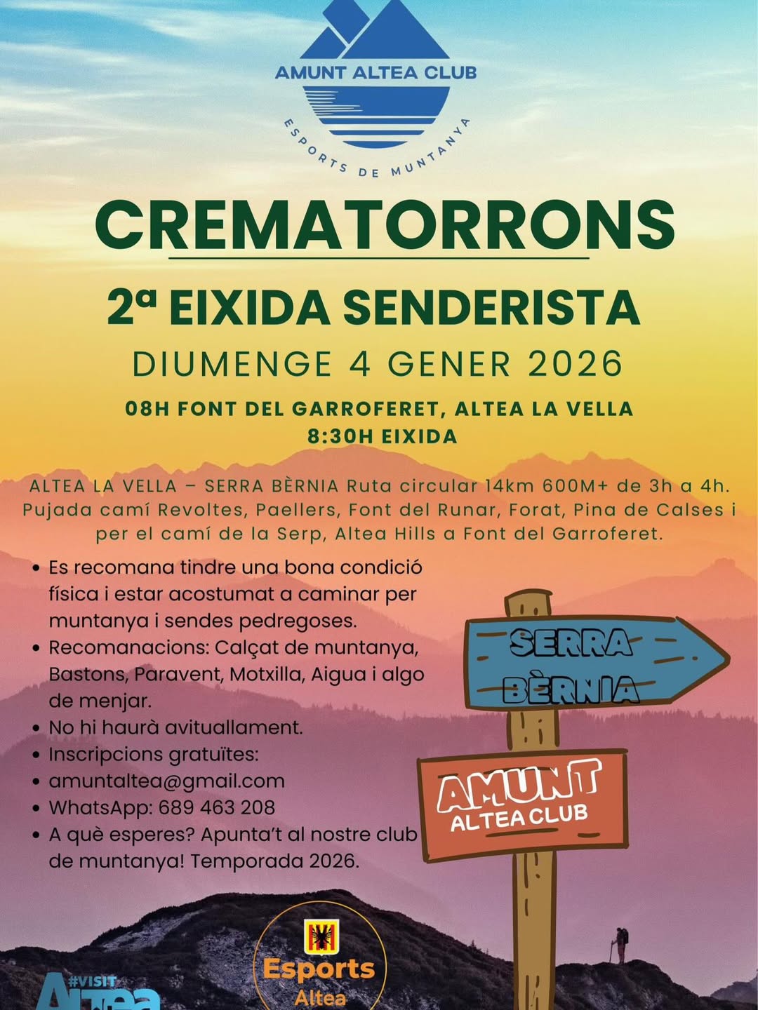 El pròxim diumenge 4 de gener de 2026, Amunt Altea Club celebrarà la segona edició de la seua eixida senderista “Crematorrons”, una activitat oberta a totes les persones aficionades al muntanyisme i a les rutes a l’aire lliure.