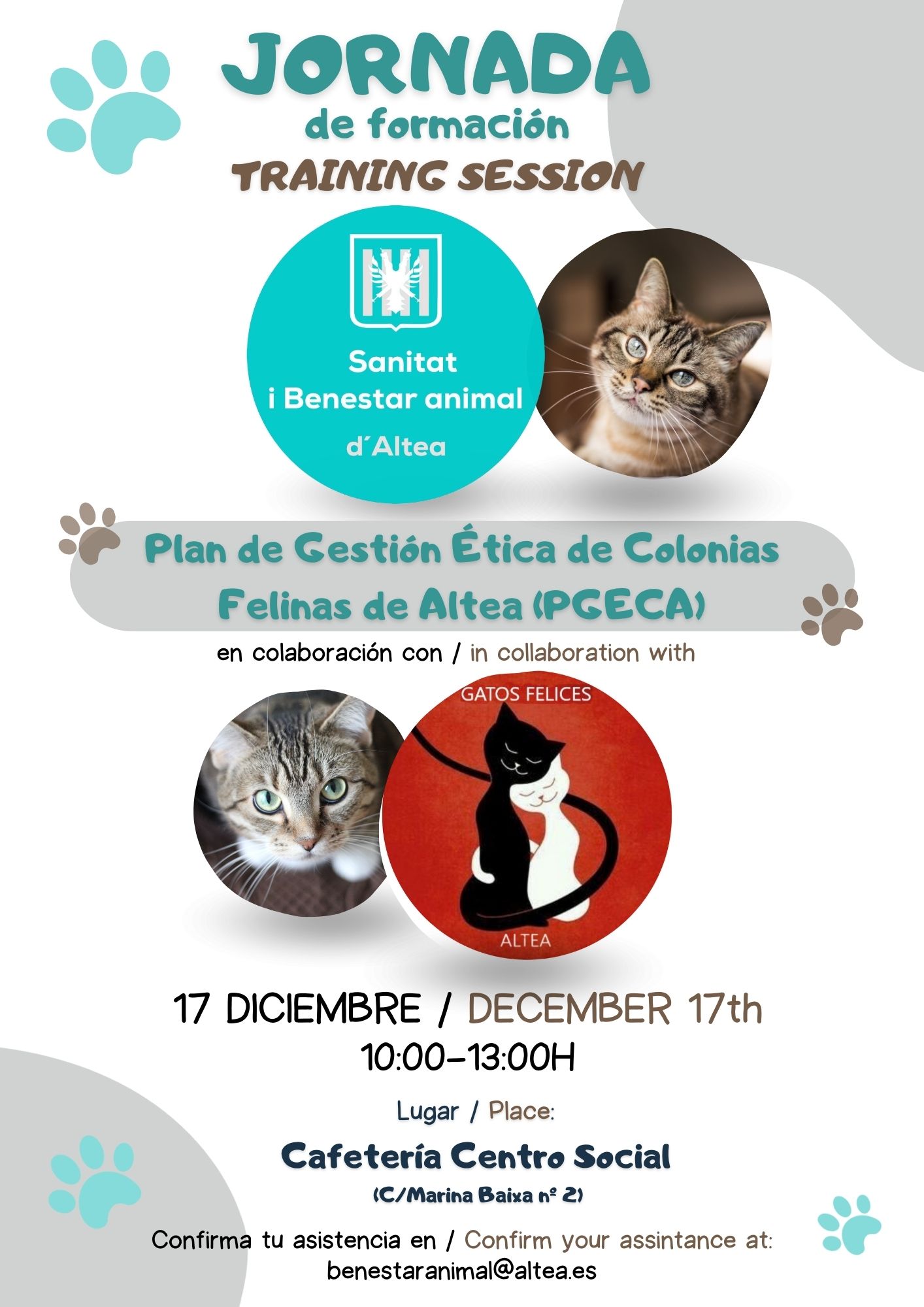 La Regidoria de Sanitat i Benestar Animal de l’Ajuntament d’Altea ha organitzat una jornada formativa adreçada als gestors i gestores de colònies felines del municipi, una activitat inclosa en el Pla de Gestió Ètica de Colònies Felines d’Altea (PGECA). La formació tindrà lloc el dimecres 17 de desembre, de 10.00 a 13.00 hores, a la cafeteria del Centre Social (c/ Marina Baixa, 2).