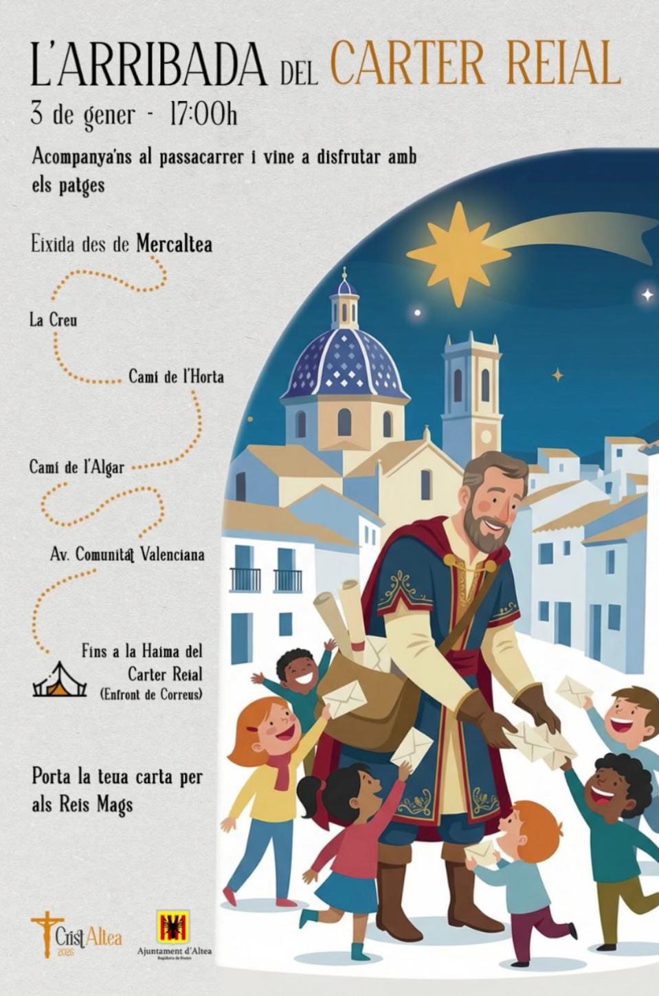 El passacarrer s’iniciarà des de Mercaltea i recorrerà La Creu, el Camí de l’Horta, el Camí de l’Algar i l’avinguda de la Comunitat Valenciana, fins arribar a la haima del Carter Reial, situada enfront de Correus. Durant el recorregut, els patges acompanyaran el Carter en un ambient festiu pensat especialment per als més menuts.