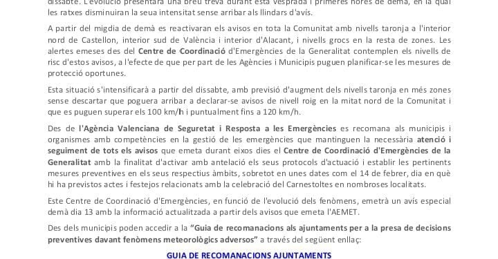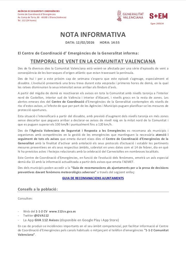 Des d’Emergències es recomana extremar la precaució, assegurar objectes susceptibles de ser desplaçats pel vent i mantindre’s atent als canals oficials davant possibles actualitzacions de l’avís.