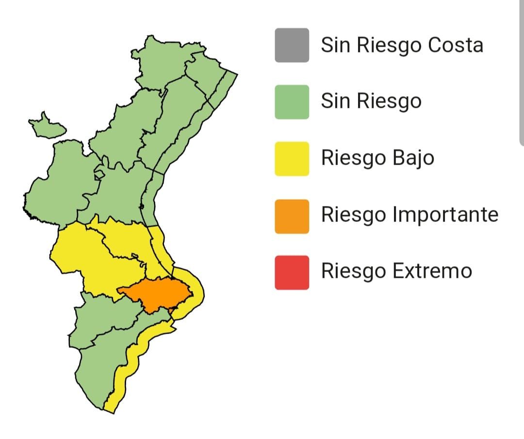 A més, es manté activa l’alerta de nivell groc per fenòmens costaners a tot el litoral d’Alacant, així com altres avisos vigents a la Comunitat Valenciana. En el cas de la província de València, continua l’alerta groga per pluges a l’interior sud i al litoral sud, així com per fenòmens costaners en esta mateixa franja.