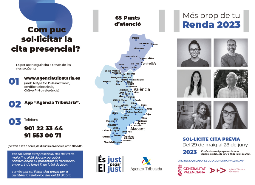 Pel que fa a les cites presencials, estes es poden demanar a www.agenciatributaria.es  amb NIF/NIE o DNI Electrònic, Certificat Electrònic, Cl@ve Pin o referència. També es pot sol·licitar a l’App “Agència Tributària” o telefonant al 901 22 33 44 ó 91 553 00 71 de 9 a 19h, de dilluns a divendres, amb NIF/NIE.