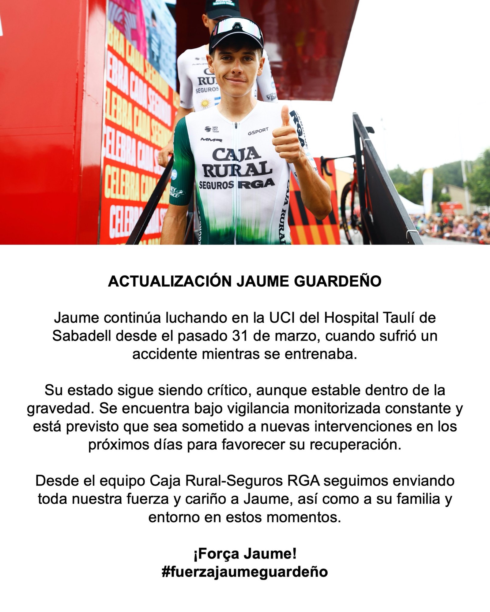El ciclista alteà Jaume Guardeño continua ingressat en estat crític a la Unitat de Cures Intensives de l’Hospital Parc Taulí, on roman des del passat 31 de març després de patir un greu accident mentre s’entrenava.
