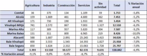 Per comarques, la Marina Baixa encapçala la reducció amb un descens de l’atur del 10%, quedant l’Alcoià amb la menor reducció anual, el 5,2%, segons es desprén d’un microinforme de INECA corresponent a la desocupació de 2025 arran de les dades publicades pel Ministeri de Treball i Economia Social. Per sectors d’activitat, la construcció arreplega la major reducció, del 9,4%, seguit de l’agricultura (9,1%) i la indústria (9%), sent del 6,7% en els serveis i de solo el 2,2% en el col·lectiu Sense activitat. Si a aquestes xifres li sumem que continua creixent el nombre de treballadors autònoms aconseguint els 149.354, un 3% més que l’any anterior, podrem dibuixar el mapa de l’ocupació a la província d’Alacant.