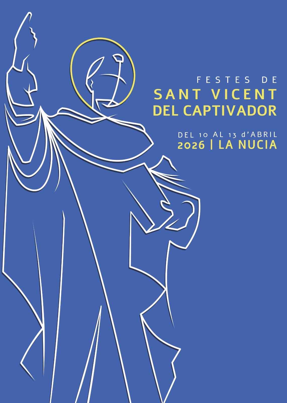 La Nucía ha presentat ja el cartell guanyador, una proposta visual elegant i contemporània que reinterpreta la tradició des d’una òptica minimalista. “Timete Deum”, obra de l’artista alcoià Pablo Sempere, destaca per un fons blau sobre el qual es dibuixa una il·lustració lineal de Sant Vicent, amb traços clars i definits. La composició incorpora elements simbòlics com l’aurèola i el gest de la mà, mentre que la tipografia en tons grocs aporta contrast i claredat al conjunt.