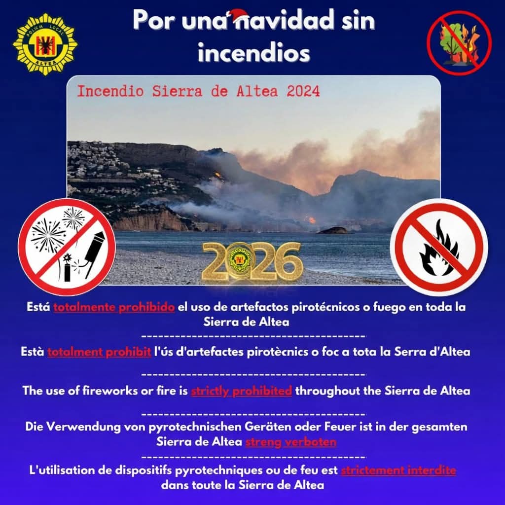 La Policia Local d’Altea ha llançat una campanya informativa amb el lema “Per un Nadal sense incendis” per recordar la prohibició total d’utilitzar artefactes pirotècnics o foc a la Serra d’Altea. Aquesta mesura, especialment important durant les celebracions de Cap d’Any, té com a objectiu evitar incendis forestals en una zona que ja va patir un greu incendi el passat 6 de gener de 2024.