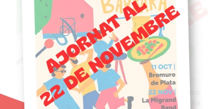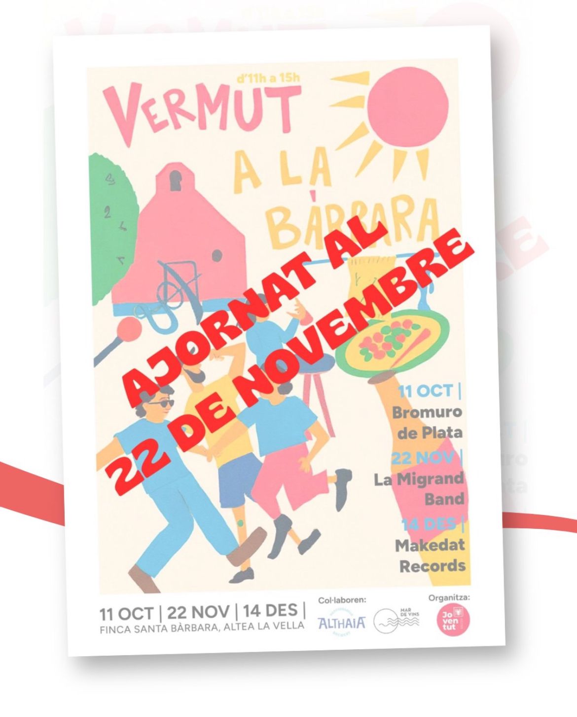El primer dels concerts del cicle “Vermut a la Bàrbara”, previst inicialment per a l’11 d’octubre, ha sigut ajornat al dissabte 22 de novembre a causa de les condicions meteorològiques adverses.