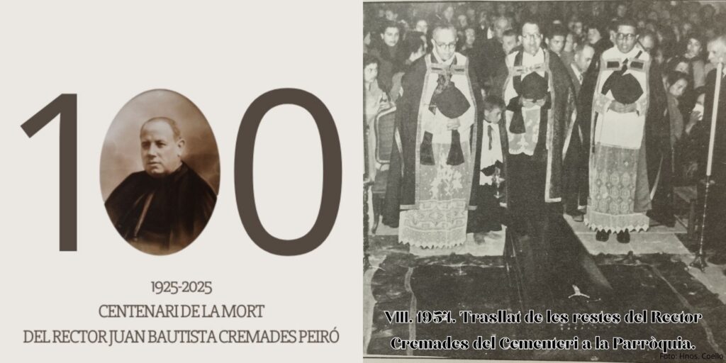 Se inició la Misa de Requiem Solemne y la predicación corrió a cargo del Canónigo de la Catedral de Valencia M.I. don José Soler Francés; al final de la Santa Misa se cantó un responso solemne a tres voces por el coro parroquial. Seguidamente se dio sepultura en la fosa que se había preparado en el Presbiterio del Altar Mayor y se colocó la lápida que allí figura (…) Los familiares del Señor Cura Cremades repartieron al final esquelas o recordatorios que llevaban la fotografía del Cura Cremades’.