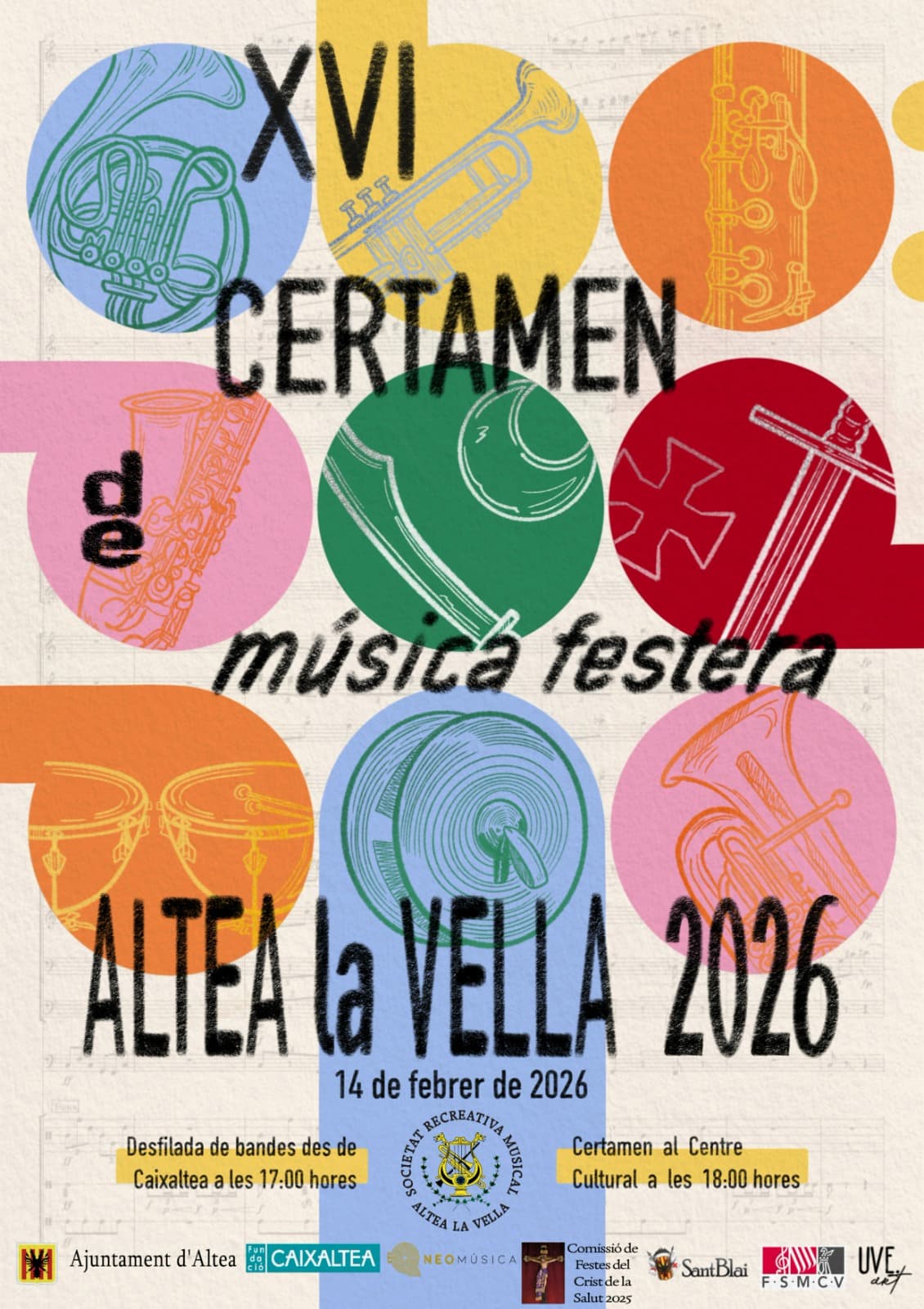 Aquest dissabte, 14 de febrer, Altea la Vella acollirà la setzena edició del seu Certamen de Música Festera. La cita musical arrancarà a les 17.00 hores amb una cercavila de les bandes participants, que recorrerà el trajecte des de Caixaltea fins al Centre Cultural. A les 18.00 hores donarà inici el concurs bandístic.